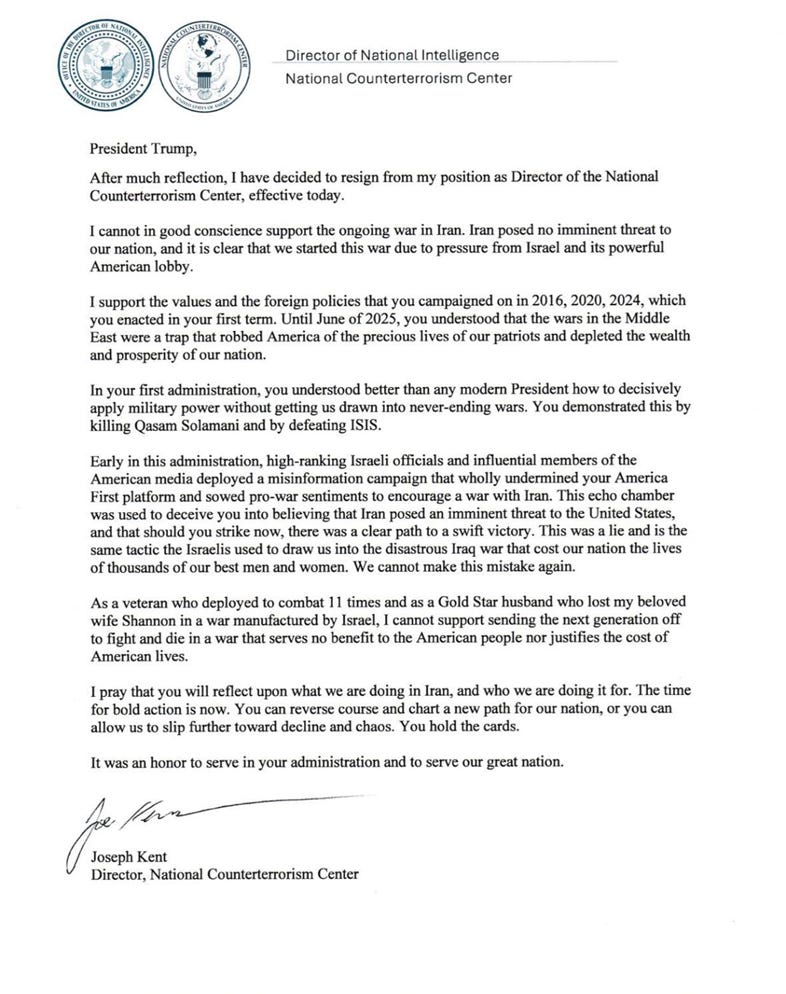 Joe Kent, a senior intelligence official appointed by Trump, this week resigned in protest, declaring that Iran posed no imminent threat to the United States and — more explosively — that the war was driven by Israeli pressure. Kent has long flirted with conspiratorial thinking and unsavory figures on the fringes of the MAGA movement. His resignation letter veered into territory that, at best, is reckless and, at worst, echoes strains of anti-Semitic tropes that have no place in serious discourse.