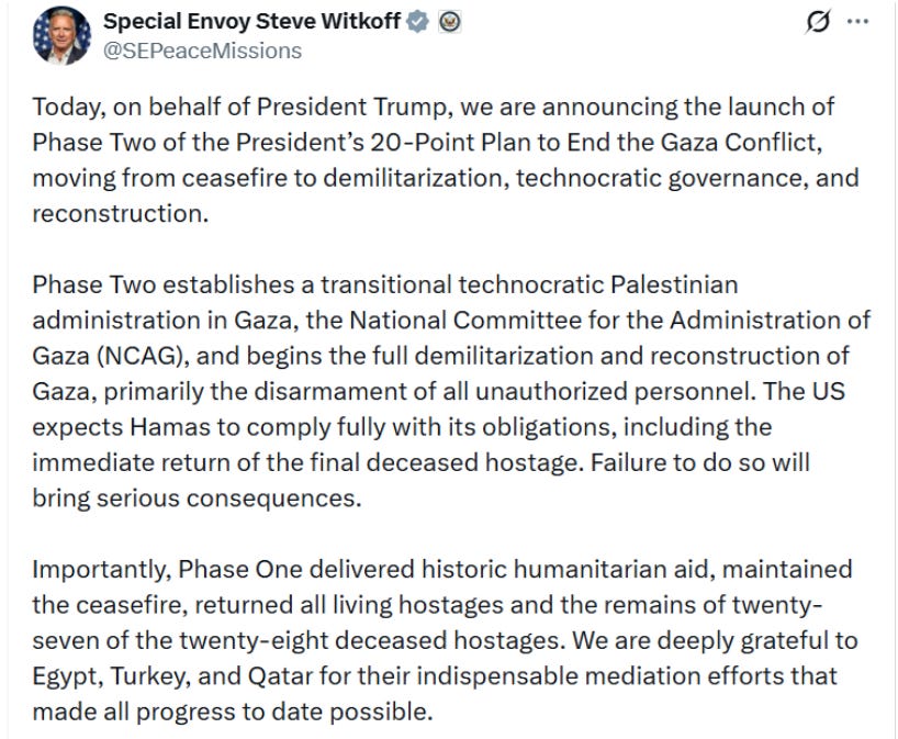 The launch of Phase II of the Trump administration’s Gaza plan, with the creation of a transitional Palestinian technocratic authority, marks an undeclared but important rupture with recent Israeli policy. A governing structure tied unmistakably to the Palestinian Authority is being assembled under U.S. sponsorship, endorsed by the PA, and tacitly accepted by Israel.